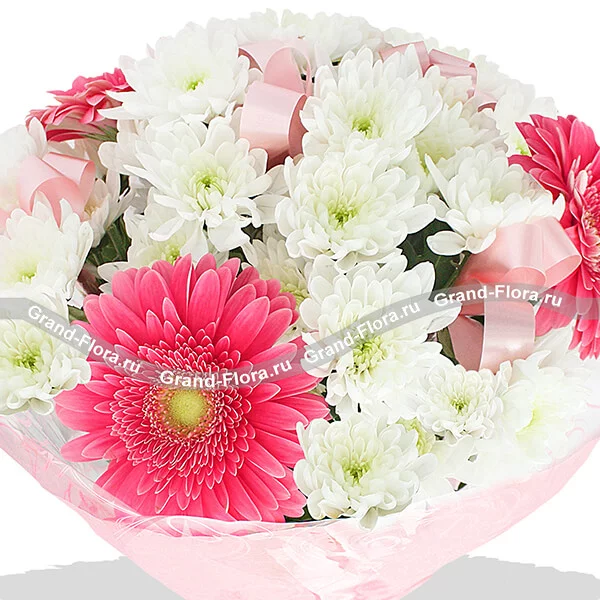 Стандартный: хризантема кустовая белая - 5 шт., гербера розовая - 3 шт., фетр розовый, лента.